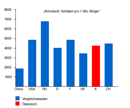 Von den mehr als 1.000.000 ausgebildeten Wehrpflichtigen im Alter von 18 bis 50 (bzw. 65) stehen etwa 25.000 im Präsenzstand (circa 14.000 Berufssoldaten und circa 10.000 Grundwehrdiener), circa 24.000 im Milizstand und theoretisch circa 945.000 im Reservestand.[98] Durch die auf sechs Monate reduzierte Grundausbildung sind die Grundwehrdiener nach Meinung der Österreichischen Offiziersgesellschaft jedoch nicht mehr feldverwendungsfähig.[99]