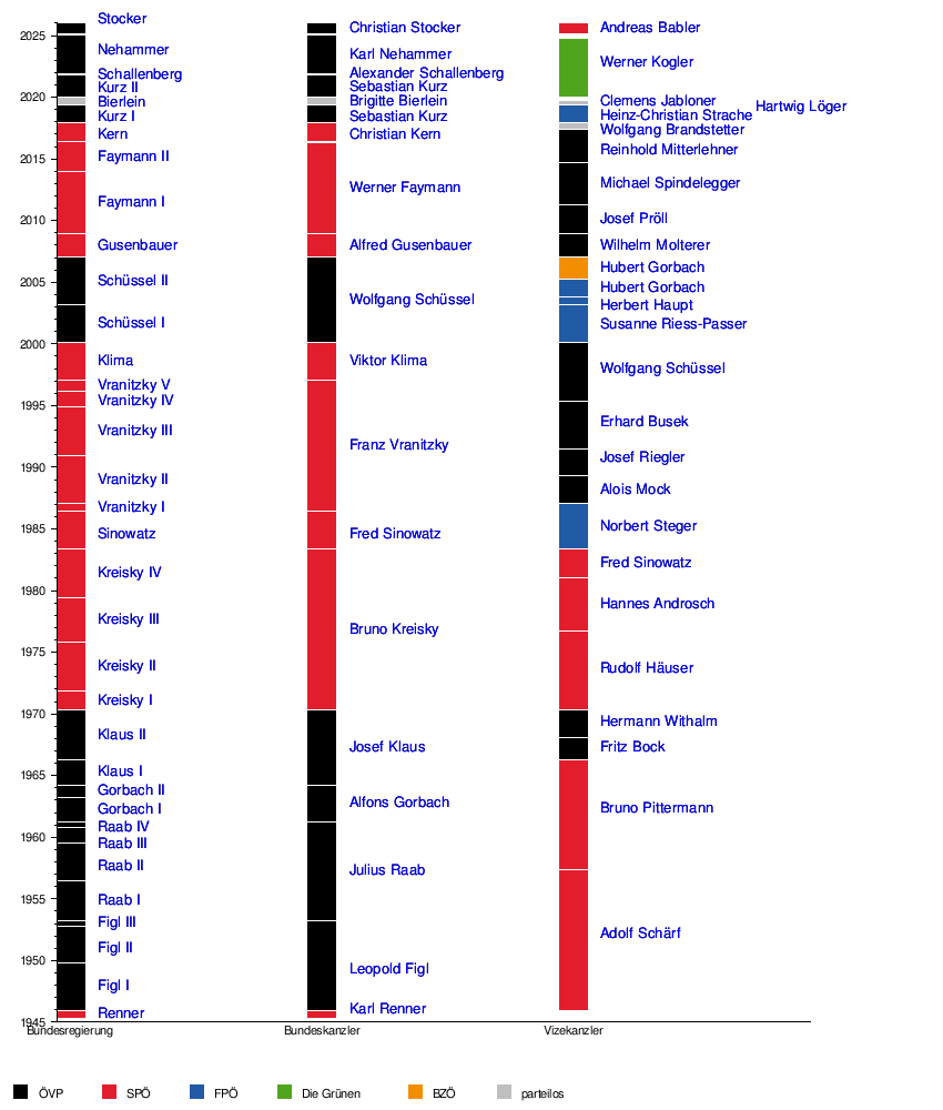 | Bundesregierung Stocker | 3. März 2025 | lfd. | 29. Sep 2024 | 155 Tage | ÖVP – SPÖ – NEOS | ||