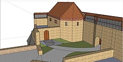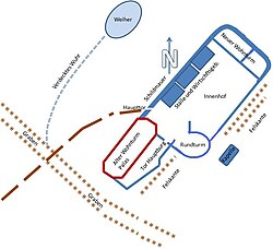 Später wurde die Nordwestmauer erheblich erweitert, so dass sie nun fünfundneunzig bis einhundert Meter lang war. Im nordöstlichen Teil der Anlage stand vermutlich ein etwa dreizehn mal zehn Meter großer Turm, dem ein massiv gemauertes, etwa sechzehn mal zehn Meter langes „Ritterhaus“ angebaut war. Wahrscheinlich waren von diesem Haus lediglich die Rück- (Festungs)mauer und Seitenwände (Festungsmauer und Turm) sowie das erste Stockwerk der Frontseite massiv gemauert. Das zweite und eventuell dritte Stockwerk dürften jedoch in Holzbauweise aufgestockt worden sein.[9]