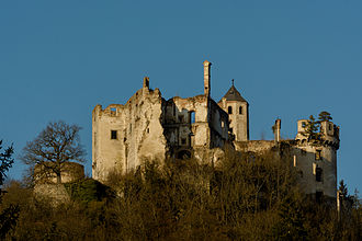| Südostansicht der Burgruine Hohenegg in der niederösterreichischen Marktgemeinde Hafnerbach . Links die Hochburg, mittig die Mittelburg und rechts die Großteils abgetragene Vorburg Die Burg ist urkundlich 1140 und 1170 genannt. Von 1584 bis 1594 wurde sie weitgehend erneuert. 1756 war die Burg als Wohnsitz abgekommen. Ab 1787 erfolgte die Abtragung der Gebäude der nördlich gelegenen Vorburg und der Verfall des Restes. | Eigenes Werk | C.Stadler/Bwag | Datei:Hafnerbach - Burgruine Hohenegg.JPG | |