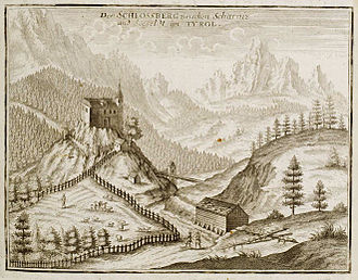 | Curioses Staats und Kriegs Theatrum Dermahliger Begebenheiten im Tyrol : durch Unterschiedliche Geographische, Hydrographische, Topographische, Chronologische, Genealogische, Historische &c. Carten, Abrisse, und Tabellen Erlaeutert , Augspurg : Stridbeck, ca. 1700 Schlossberg zwischen Scharniz und Seefeldt | http://diglib.hab.de/drucke/ge-737-1b-1s/start.htm (for document number, see filename) | Johann Stridbeck | Datei:Begebenheiten im Tyrol 00007 Schlossberg zwischen Scharniz und Seefeldt.jpg | |