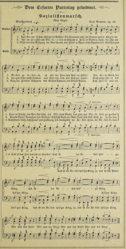 Max Kegel, Carl Gramm: Sozialistenmarsch (zum Erfurter SPD-Parteitag 1891) | Beilage zum "Wahren Jacob" Nr. 136 , 1891 | Max Kegel (words); Carl Gramm (music) | Datei:Sozialistenmarsch (Max Kegel - Carl Gramm).png |