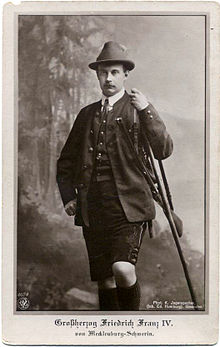 | Großherzog Friedrich Franz IV als Jäger vor einer gemalten Waldkulisse im Fotostudio des Carl Jagerspacher in Gmunden/Österreich | https://www.flickr.com/photos/mrsfujita/2684679317/sizes/o/in/set-72157604203538159/ | Carl Jagerspacher | Datei:Friedrich Franz IV als Jäger im Fotostudio.jpg |