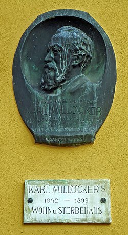 | Gedenktafel (aus 1925) am Wohn- und Sterbehaus von de:Carl Millöcker , Conrad-von-Hötzendorf-Platz 8, de:Baden bei Wien Reliefportrait: de:Hans Mauer (1879–1962) | Eigenes Werk | Earnest B | Datei:Gedenktafel-Wohn--und-Sterbehaus-Carl-Millöckers-(010315).jpg | |