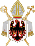 | Wappen des Bistums bzw. des ehemaligen Fürstbistums und Hochstiftes Trient | Own Work, For the blazon see Gatz, Erwin (Hg.): Die Wappen der Hochstifte, Bistümer und Diözesanbischöfe im Heiligen Römischen Reich. 1648-1803, S. 570 and P. Frumenzio Ghetta, L'Aquila stemma di Trento e del'Trentino, Trento 1973. | David Liuzzo | Datei:Wappen Bistum Trient.png |