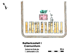 Da die Eroberungspolitik des Augustus von seinen Nachfolgern verworfen wurde, begann man unter den flavischen Kaisern mit dem Aufbau einer Grenzsicherungsorganisation. Unter Vespasian (69–79) wurde das Holz-Erde-Lager durch einen Steinbau ersetzt.[30] Die westliche Flanke Carnuntums wurde durch das Legionslager in Vindobona geschützt. Unter seinem Nachfolger Domitian wurde etwa 1,2 Kilometer südwestlich des Lagers zusätzlich ein Kastell für eine 500 Mann starke Reitereinheit angelegt. Sie sollte eine größere Mobilität der Truppen bei der Grenzüberwachung gewährleisten. In den Jahren 85 bis 86 erlitten die Römer eine Niederlage gegen die Daker. Die Kämpfe griffen in weiterer Folge auch auf die Region um Carnuntum über. Domitian sah sich daher genötigt, persönlich in Pannonien zu erscheinen, um die Abwehrmaßnahmen zu koordinieren. Während eines in den Jahren 89 und 90 gegen Markomannen und Quaden geführten Feldzuges hielt sich der Kaiser wohl auch in Carnuntum auf. Auf seinen Befehl wurden zur Verstärkung des Donauheeres weitere Truppen nach Pannonien verlegt, für die ebenfalls neue Kastelle errichtet werden mussten. Dazu dürfte auch das Reiterlager gehört haben. 97 konnte der Krieg, der sogenannte bellum Germanicum et Sarmaticum, mit einem Sieg der Römer beendet werden.[31]
