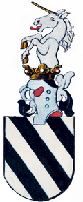 1359: In Silber drei schrägrechte schwarze Balken (D’argento a tre bande di nero).[9][10][11] Über dem gekrönten Helm ein wachsendes nach der rechten Seite sehendes silbernes Einhorn.