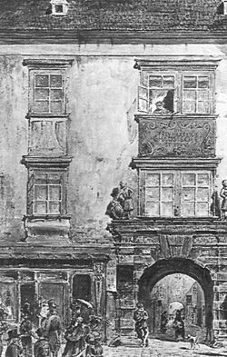 | Chaossches Stiftungshaus, Vienna before demolition in 1873 | Waterclour by Emil Huetter, 1873 | Emil Huetter, scan by Robert Schediwy | Datei:ChaosStiftgH1873.JPG |