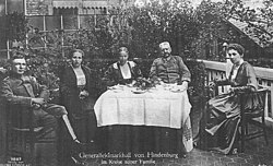 | German Field-Marshall Paul von Hindenburg gathered with his family on the occasion of his 70th birthday in 1917. Left to right: Hindenburg's son in law Christian von Pentz, Annemarie von Pentz (née Hindenburg), Mrs. von Hindenburg, Hindenburg, irmengard von Brockhusen (née Hindenburg). | Postcard produced in 1917 | Herr von Brockhusen (+1928) | Datei:Hindenburgfamily0001.jpg |