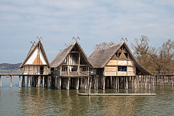 | Südostansicht des bronzezeitlichen Dorfs „Unteruhldingen“ mit (von links nach rechts) den Häusern „Kult und Religion“, „Architektur“ und dem „Haus der Fragen“. | Selbst fotografiert | Andreas F. Borchert | Datei:Pfahlbaumuseum Unteruhldingen Bronzezeitdorf Unteruhldingen SO 2010 04 10.jpg | |