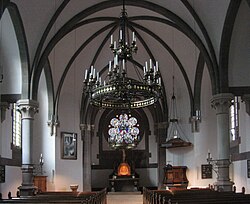 Glasfenster befinden sich im Chor und im Langhaus. Die Orgel aus dem Jahr 1885 stammt von der Firma G. F. Steinmeyer & Co.
