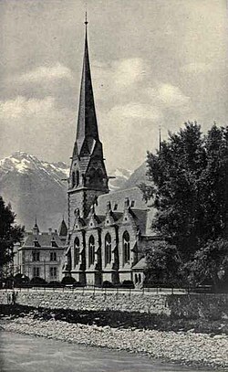 Im Zuge des wachsenden Kurbetriebs in Meran bildeten sich die Anfänge der evangelischen Kirche in der Stadt. 1861 erfolgte die Stiftung eines Bethauses und einer Pfarrwohnung in der Hallergasse 24 im oberen Steinachviertel sowie die Errichtung eines evangelischen Friedhofs bei der Spitalkirche.[1] Der erste ständige Pfarrer wurde 1870 berufen. Die rechtliche Gründung der lutherischen Gemeinde Merans erfolgte 1876 (als Gemeinde der Evangelischen Kirche A.B. in Österreich). Die neugotische Christuskirche wurde nach Plänen des deutschen Architekten Johannes Vollmer in den Jahren 1883–1884 errichtet und 1885[2] eingeweiht. Sie war das erste evangelische Kirchengebäude Tirols. 1896 wurde der neue evangelische Friedhof am Greutendamm (heute Marlinger Straße) angelegt. 1904 wurde in der Weingartenstraße in Untermais eine evangelische Volksschule eröffnet.