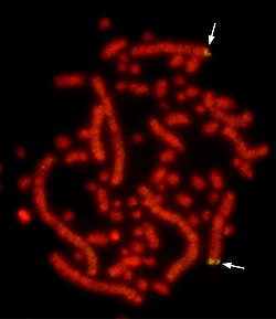 | Metaphasechromosomen des Huhns. Typisch für Vögel sind die Microchromosomen, die deutlich kleiner sind als die Macrochromosomen. In diesem Präparat wurde eine Fluoreszenz in situ Hybridisierung auf einen Genort (β-defensin Gencluster) auf dem q-Arm des Chromosoms 3 (grün, weiße Pfeile) und eine Gegenfärung mit dem Nucleinsäure-Farbstoff Propidiumiodid (rot) durchgeführt. | BMC Genomics 2004, 5:56 doi:10.1186/1471-2164-5-56 Figure 4 | Yanjing Xiao, Austin L Hughes, Junko Ando, Yoichi Matsuda, Jan-Fang Cheng, Donald Skinner-Noble and Guolong Zhang | Datei:ChickenChromosomesBMC Genomics5-56Fig4.jpg | |