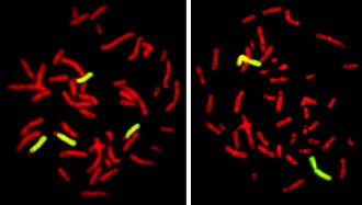 | DNA des menschlichen Chromosoms 2 wurde markiert, per Fluoreszenz in situ Hybridisierung auf Metaphase-Chromosomen des Orang-Utan (links) und des Menschen (rechts) gegeben und grün angefärbt. Während beim Menschen dadurch nur die beiden Kopien des Chromosoms 2 angefärbt wurden, wurden beim Orang-Utan die Kopien der beiden ursprünglichen Chromosomen markiert (siehe de:Chromosom #Chromosomenevolution ). Die restlichen Chromosomen sind durch eine DNA-Färbung rot gefärbt. Das menschliche Chromosom 2 setzt sich aus Teilen zusammen, die bei den Menschenaffen noch auf zwei Chromosomen verteilt sind. Die Fusion fand also nach der Trennung von den Schimpansen statt. Der Fusionspunkt liegt bei 2q13-14. | Stefan Müller, Department Biologie II der Ludwig-Maximilians-Universität München. | Verena Schubel, Stefan Müller, Department Biologie der Ludwig-Maximilians-Universität München. | Datei:Chr2 orang human.jpg | |