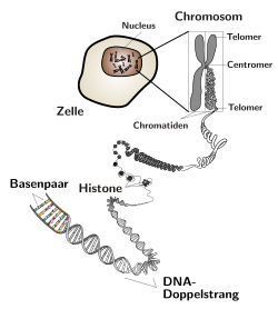 Ein Chromosom (von altgriechisch χρῶμα chrōma ‚Farbe‘ sowie σῶμα sōma ‚Leib‘)[1][2] ist ein Träger von Erbanlagen (des Genoms). Chromosomen bestehen aus Desoxyribonukleinsäure (englische Abkürzung: DNA) und verschiedenen Proteinen, insbesondere Histonen. Die DNA enthält genetische Informationen für die Lebensprozesse und die Vererbung von Eigenschaften.