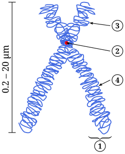 1 DNA- Doppelhelix 2 10-nm-Fiber ( DNA mit Nukleosomen) 3 Schematisierter Chromatinstrang während der Interphase vor der DNA-Verdopplung mit Centromer 4 Kondensiertes Chromatin während der Prophase (nun aus zwei Chromatiden bestehend, weil sich die DNA verdoppelt hat) 5 Metaphasechromosom Die Teilabbildungen 3 bis 5 sind rein schematisch zu verstehen, um die Anzahl der Chromatiden während verschiedener Phasen des Zellzyklus wiederzugeben. Die Anordnung des „Chromatinfadens“ gibt nicht die tatsächliche Struktur wieder. |