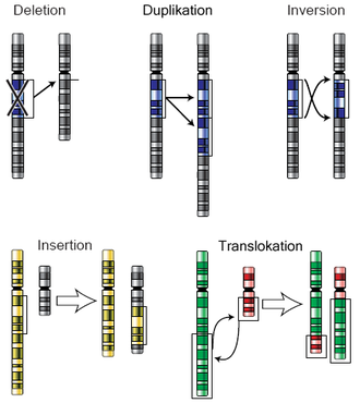 | Schema möglicher Chromosomenmutationen. | Talking Glossary of Genetics . The pdf version from this web site was used as source for this image file. Several alterations have been made to the layout, captions were translated to German (c -> k in Duplication and Translocation). | Original author unknown. Changes as described by de:user:Dietzel65 | Datei:Chromosomenmutationen.png | |