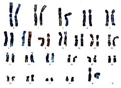 | Chromosom 1 aus einem männlichen, menschlichen Karyotyp mit G-Bänderung. | Talking Glossary of Genetics . The pdf version from this web site was used as source for this image file to obtain a better resolution than in the image embedded in the web site. Chromosome 1 was clipped from the complete karyotype (see other versions) | unknown. From the Website of The National Human Genome Research Institute. | Datei:Chromosome1-G-bands.jpg | |