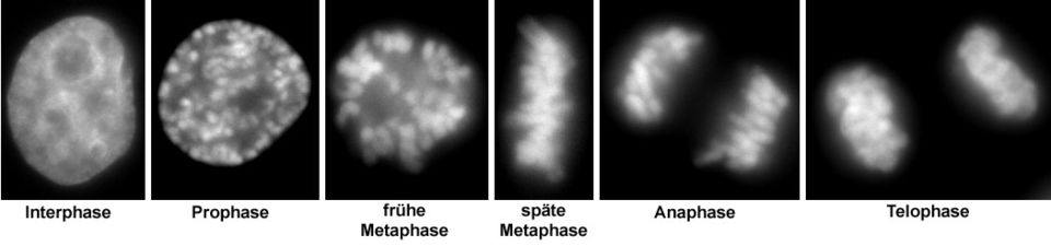 Im Folgenden sind die Phasen während der Mitose kurz wiedergegeben: