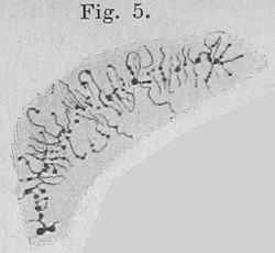 „Chromatischer Faden, welcher einer Flaschenbürste vergleichbar ist“ (nach heutiger Terminologie ein Lampenbürstenchromosom) aus dem Kern einer Eizelle des Wassersalamanders (Triton). (Gesamte Tafel.) Oscar Hertwig, 1906. |