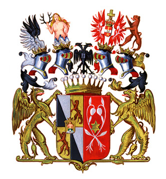 Blasonierung: Das gemehrte Wappen der von 1792 zeigt einen der Länge nach geteilten oder zusammengeschobenen Hauptschild; die rechte Seite ist quadriert mit Herzschild; im goldenen, mit einer Spitzenkrone gekrönten Herzschild wächst hinter drei natürlichen Felsen eine nackte Jungfrau mit einem grünen Kranze auf dem Kopfe und mit fliegendem blonden Haar empor, welche in der Rechten ein Hirschgeweih emporhebt, die Linke aber in die Hüfte stemmt; 1 und 4 von Schwarz und Silber schrägrechts geteilt. (erloschene von Nopping)[10] 2 und 3 in Gold eine aufgerichtete rechtshin springende schwarzgraue Katze (verstorbene von Polching); die linke Seite des Schildes zeigt in Rot zwei silberne, aus gemeinschaftlicher Wurzel an langen Stängeln emporgewachsene und einwärtsgekehrte Seeblumenblätter [oder Lindenblätter] (Martinic) und dazwischen ein achtstrahliger goldener Stern (erloschene Grafen von Sternberg); auf der Grafenkrone stehen vier gekrönte Helme und zwischen diesen in der Mitte der doppelte schwarze kaiserliche mit F. II bezeichnete Adler; der rechte Helm trägt einen geschlossenen von Schwarz und Silber schrägrechts geteilten Adlersflug (erloschene von Nopping), der zweite die wachsende Jungfrau des Herzschildes; über dem dritten Helme schwebt zwischen zwei roten Flügeln, von denen jeder mit einem silbernen Seeblatt an einem langen Stängel belegt ist, das kaiserliche Hauswappen mit der Krone, auf dessen silbernem Querbalken sich der Buchstabe M, im roten Feld oben F und unten der Buchstabe R finden: „F. M. R.“, drei Kaiser: Ferdinand, Matthias, Rudolf (erloschene Grafen Martinic); auf dem linken Helme steht die Katze des 2. und 3. Feldes; die Decken des rechten und dritten Helmes sind rot und silbern, die des zweiten und linken schwarz und golden; den Schild halten zwei einwärtssehende goldene Greife.[4][19]