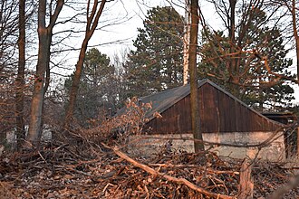 ![]() Verwildertes Areal des geophysikalischen Observatoriums Wien-Cobenzl im Dezember 2016. Im Vordergrund rechts ist das erdmagnetische Variationshaus zu sehen. Das links dahinter liegende Absoluthaus ist durch die Vegetation verdeckt. Im Hintergrund ist das helle Gebäude des seismischen Observatoriums zu sehen. Die Gebäude blieben seit ihrer Errichtung 1955 nahezu unverändert.[1] Das Observatorium wurde im April 2016 geschlossen. |