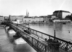 Die Vorgängerkonstruktion der Linzer Nibelungenbrücke im Jahr 1910 | Archiv der Stadt Linz (Fotogalerie auf www.nachrichten.at - Deep Space Live, 25. Jänner 2011) | unbekannt | Datei:Donaubrücke Linz Innenstadt - Urfahr 1910.png |