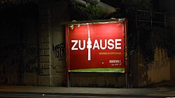 | Plakat der DoGeWo21 an der S-Bahn-Brücke Hohe Straße in der südlichen Dortmunder Innenstadt, gesehen am Abend des 7. Mai 2016. | Eigenes Werk | Joehawkins | Datei:Dogewo21-Plakat Hohe Straße.JPG |