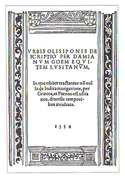 | Title page of Damiào de Góis, Urbis Olisiponis descriptio (Évora, 1554). | 1554 edition | Damião de Góis | Datei:Gois Urbis Olisiponis.jpg | |