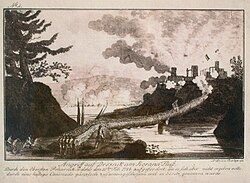 Angriff auf Dresnik am Korana Fluß. Durch den Obersten Peharnik, welches den 10ten Feb. 1788 aufgefordert, da es sich aber nicht ergeben wolte, durch eine heftige Canonade gänzlich zusamengeschossen und in besitz genomen wurde. | Antonn Balzer | Datei:Dresnik-1788.jpg | ||