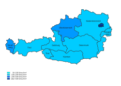 Österreich hat eine Bevölkerungsdichte von 108 EW/km², wobei nur 38,6 % des Staatsgebiets als potentiell besiedelbar gelten. Die Bevölkerungsdichte bezogen auf die besiedelbare Fläche wäre also deutlich höher, 279 EW/km². Das am dichtesten besiedelte Bundesland Österreichs ist die Hauptstadt Wien, das rund 4.500 Einwohner (EW) pro Quadratkilometer (km²) zählt. Mit deutlichem Abstand an zweiter Stelle liegt Vorarlberg mit 149 EW/km², gefolgt von Oberösterreich mit 122 EW/km². Alle übrigen Bundesländer haben zwischen 50 und 100 EW/km². Für stark alpin geprägte Bundesländer ergeben sich deutlich höhere Bevölkerungsdichten wenn die Bevölkerung nur auf deren besiedelbare Fläche bezogen wird.