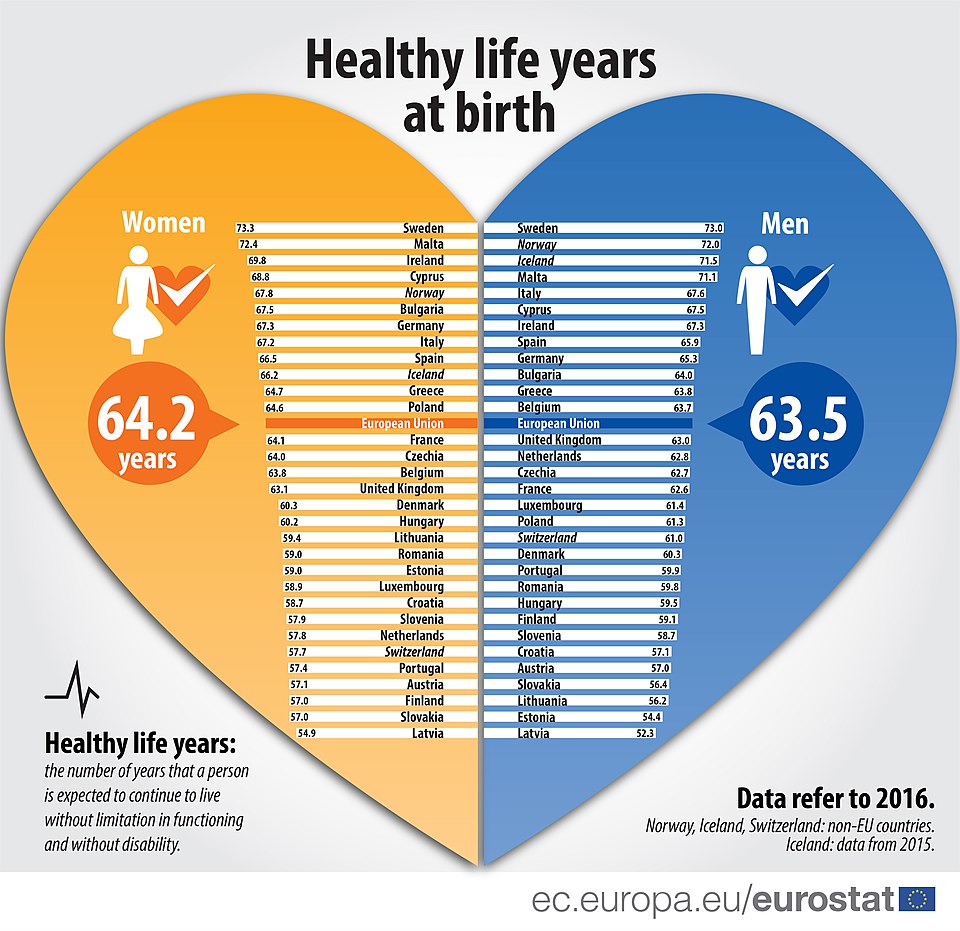| Gesundheitserwartung (getrennt nach Geschlecht bei der Geburt) in den EU-Staaten (2016) | https://ec.europa.eu/eurostat/statistics-explained/index.php?title=Healthy_life_years_statistics#Healthy_life_years_at_birth | EuroStat Statistik | Datei:Healthy life years at birth-EU-2016.jpg | |