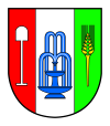- „Im zweifach gespaltenen Schild im Mittelfeld auf Silber ein blauer dreischaliger Springquell, in den Flanken je pfahlweise rechts in Rot ein auf den Griff gestelltes silbernes Grabscheit, links in Grün eine goldene gestielte Getreideähre.“