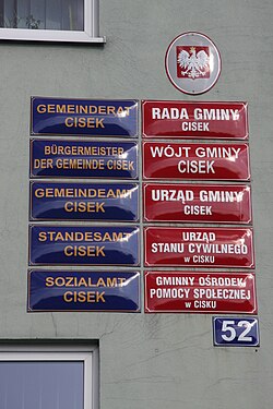 | Dwujęzyczne tablice na urzędzie gminnym w miejscowości Cisek (gmina Cisek, powiat kędzierzyńsko-kozielski, województwo opolskie) | Eigenes Werk | Aotearoa | Datei:Cisek2.jpg | |