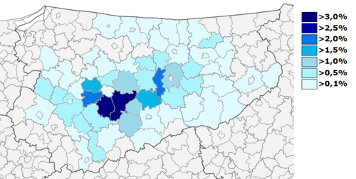 - ↑ Den größten Anteil haben folgende Kreise: Opole: 27.870, Strzelce: 17.635, Kędzierzyn-Koźle: 13.989, Krapkowice: 13.175, Prudnik: 9.433, Olesno: 8.803 und Kluczbork: 7.073.
