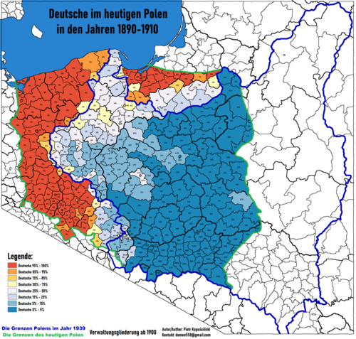 Im Jahr 1931 lebten in Polen etwa 741.000 Deutsche, die jedoch in keinem Bezirk und keiner Stadt die Mehrheit stellten. Die meisten Deutschen lebten – als Minderheiten – noch in den Gebieten, die vor 1914 zum deutschen Staat gehörten (in den Regionen Posen und Pommern, ausgenommen Ostoberschlesien, lebten etwa 370.000 Deutsche, die jedoch nirgendwo die Mehrheit bildeten), als Minderheiten lebten sie aber auch in den Gebieten, die zu Russland gehörten (Łódź, Warschau und Umgebung, Wolhynien und andere) und Österreich-Ungarn (Bielitz, Krakau, Lemberg).[9][10]