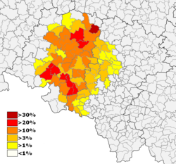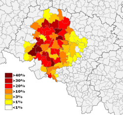 | Deutsche Minderheit in Masuren und Ermland (Südhälfte Ostpreußens) Nach der Volkszählung 2002 Quellen der Prozentzahlen: Polnisches Statistikamt | Grafik selbst erstellt | Jonny84 | Datei:Deutsche Minderheit Masuren Ermland.png | |