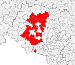 Gemäß dem polnischen Minderheitengesetz von 2005 können Gemeinden ab einem Minderheitenanteil von mindestens 20 % offiziell als zweisprachig anerkannt werden und Deutsch als sog. Hilfssprache einführen. Dabei werden die Ergebnisse der polnischen Volkszählung von 2002 herangezogen, wonach 28 Gemeinden diesen Anteil von Deutschen an der Gesamtbevölkerung erreichen:[27] Biała/Zülz, Bierawa/Birawa, Chrząstowice/Chronstau, Cisek/Czissek, Dobrodzień/Guttentag, Dobrzeń Wielki/Groß Döbern, Głogówek/Oberglogau, Izbicko/Stubendorf, Jemielnica/Himmelwitz, Kolonowskie/Colonnowska, Komprachcice/Comprachtschütz, Krzanowice/Kranowitz, Lasowice Wielkie/Groß Lassowitz, Leśnica/Leschnitz, Łubniany/Lugnian, Murów/Murow, Olesno/Rosenberg O.S., Pawłowiczki/Pawlowitzke, Polska Cerekiew/Groß Neukirch, Popielów/Poppelau, Prószków/Proskau, Radłów/Radlau, Reńska Wieś/Reinschdorf, Strzeleczki/Klein Strehlitz, Tarnów Opolski/Tarnau, Turawa, Ujazd/Ujest, Walce/Walzen sowie Zębowice/Zembowitz. Bis auf Kranowitz, das der Woiwodschaft Schlesien angehört, liegen alle Gemeinden in der Woiwodschaft Oppeln.