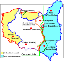 Auf der Teheran-Konferenz vom 28. November bis zum 1. Dezember 1943 entschieden die Regierungschefs der Hauptalliierten Roosevelt, Churchill und Stalin ohne Beteiligung polnischer Vertreter die „polnische Westverschiebung“[20] und die Zwangsumsiedlung der polnischen Bevölkerung aus dem bereits 1939 von der Sowjetunion annektierten Ostpolen. Als Ausgleich für die polnischen Gebietsverluste wurde die Besetzung deutscher Ostgebiete, die unter polnische Verwaltung gestellt werden sollten, vereinbart. Das führte zur Vertreibung der deutschen Bevölkerung aus den ostdeutschen Gebieten östlich der Oder-Neiße-Linie.