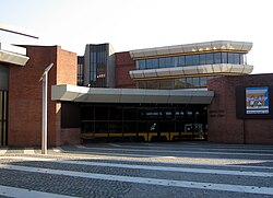 | Haupteingang der Deutschen Schule Barcelona in Esplugues de Llobregat mit dem Windobjekt von Hein Sinken links im Anschnitt | |