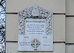 | Im Ober-St. Veiter Casino erklang am 19. März 1893 zum ersten Mal der Deutschmeistermarsch von Wilhelm Jurek. 1893 - 1953, Gewidmet von der Gesellschaft der Wiener in Wien. | Eigenes Werk | Herzi Pinki | Datei:Plaque for Deutschmeistermarsch, Hietzinger Hauptstraße 141.jpg |