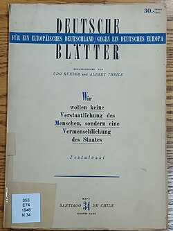 | Edición Número 34 del Deutsche Blätter (septiembre 1946). Ejemplar del semanario en alemán conservado en el Archivo Histórico Emilio Held Winkler. Impreso en Santiago de Chile. | Eigenes Werk | José Ignacio Gallardo | Datei:Deutsche Blätter N° 34.jpg | |