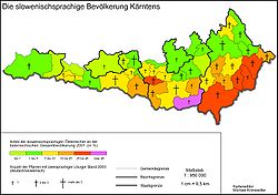 | Anteil der slowenischsprachigen Bevölkerung Kärntens 2001 sowie Anzahl der PFarren mit slowenischsprachiger Liturgie 2003. | Drawn by Geiserich77 | Geiserich77 | Datei:Kaerntner Slowenen Pfarren.jpg |