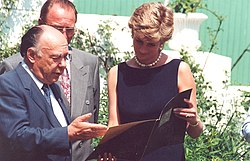 Nach der Scheidung reduzierte Diana ihr Personal im Kensington Palace und Paul Burrell nahm eine wichtigere Rolle in ihrem Privatleben ein. Außerdem verringerte sie ihr Engagement im Wohltätigkeitsbereich. Von den ursprünglichen etwa hundert Organisationen, für die sie sich einsetzte, blieben nunmehr sechs übrig, darunter das Royal Marsden Hospital, die Lepramission und die Nationale Aidsstiftung. Dafür bekam sie 1995 den russischen International Leonardo Prize.[78] Diana brach mit Sarah Ferguson, als diese ihre Memoiren veröffentlichte und sich an einer Stelle negativ über ihre frühere Schwägerin äußerte. Ferguson bat sie um Verzeihung; Diana weigerte sich, sich mit ihr zu versöhnen. Dafür wurde ihre Stiefmutter Raine Spencer, mit der sie sich 1993 versöhnt hatte, zu einer neuen Verbündeten. Die Jahre der Trennung von Charles ließen Raine Spencer in einem neuen Licht erscheinen.[79] Im ersten Jahr nach der Scheidung normalisierte sich Dianas Beziehung zu Charles. Außerdem stabilisierte sich Dianas Privatleben.[64]