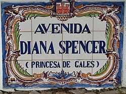 | Straßentafel in Cascais (Portugal) zur Erinnerung an Diana Spencer, Prinzessin von Wales. | Selbst fotografiert | Mehlauge | Datei:Avenida Diana Spencer (Cascais).JPG | |