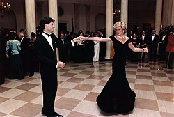 Im November 1985 statteten Diana und Charles dem US-Präsidentenpaar Ronald und Nancy Reagan anlässlich eines Staatsbanketts einen Besuch ab. Am 9. November tanzte Diana mit dem US-Filmschauspieler John Travolta in der Entrance Hall des Weißen Hauses zu den Klängen von Saturday Night Fever. Obwohl der Tanz nur etwa zehn Minuten dauerte,[41] handelte es sich dabei um einen entscheidenden Moment in Dianas Verwandlung zur weltweiten Berühmtheit.[42] Gleichzeitig erhielt Travoltas Karriere nach einem Tiefpunkt wieder einen entscheidenden Auftrieb.[43] Während des darauf folgenden Dinners speiste Diana neben dem russischen Ballettchoreographen Mikhail Baryshnikov.