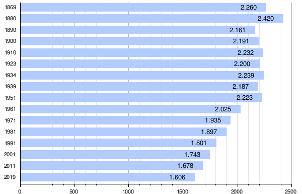Die Einwohnerzahl blieb in der ersten Hälfte des 20. Jahrhunderts konstant, geht seither jedoch zurück. Der Rückgang in den letzten Jahrzehnten wird durch die Abwanderung bestimmt, die Geburtenbilanz ist ausgeglichen.[5]