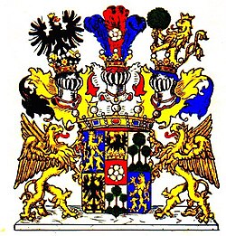 1754: Das alte Wappen wurde gebessert durch die Freiherrnkrone und einen dritten gekrönten Turnierhelm, der in die Mitte gestellt, mit rot-weißen Decken drei Straußenfedern trägt, eine rot, mit einer weißen Rose belegte, zwischen zwei blauen. Die Decken des rechten Helmes in schwarz-gold, jene des linken blau-gold. Schildhalter: zwei goldene Greife.[8] Er war Begründer der ersten, älteren Linie.[9]