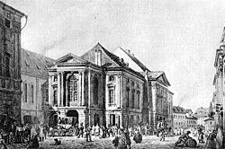 | Ständetheater von Vinz. Morstadt, ehemals Nationaltheater des Grafen Nostitz. Links: Carolinum, rechts: im hintergrund Obstmark. Um 1830. Lav. Sepiazeichnung. | Oskar Schürer: Prag; Rohrer Verlag; Brünn 1935; S.281 | Karel K. | Datei:Praha Staendetheater 00.jpg |