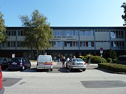 Die Schule besteht aus zwei Volks- und zwei Hauptschuleinheiten mit einem Turnsaal. Die parallel angeordneten Bauten wurden mit einem niedrigen Verbindungsgang verbunden. Moderner Stahlbetonskelettbau wurden mit traditionellen Formen wie Bruchsteinmauerwerk und Ziegelbau verbunden. Glasmosaikbetonfenster erzeugen eine farbige Innenwirkung.